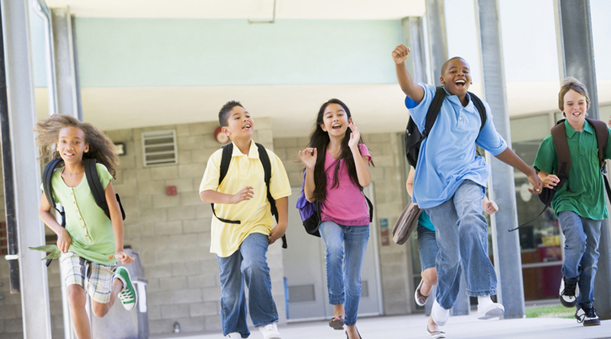 Elementary school pupils running outside